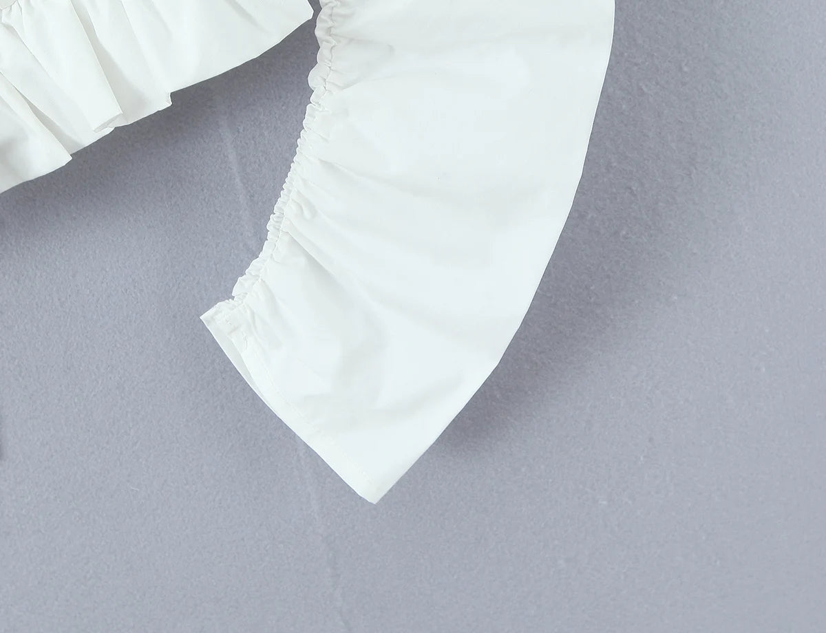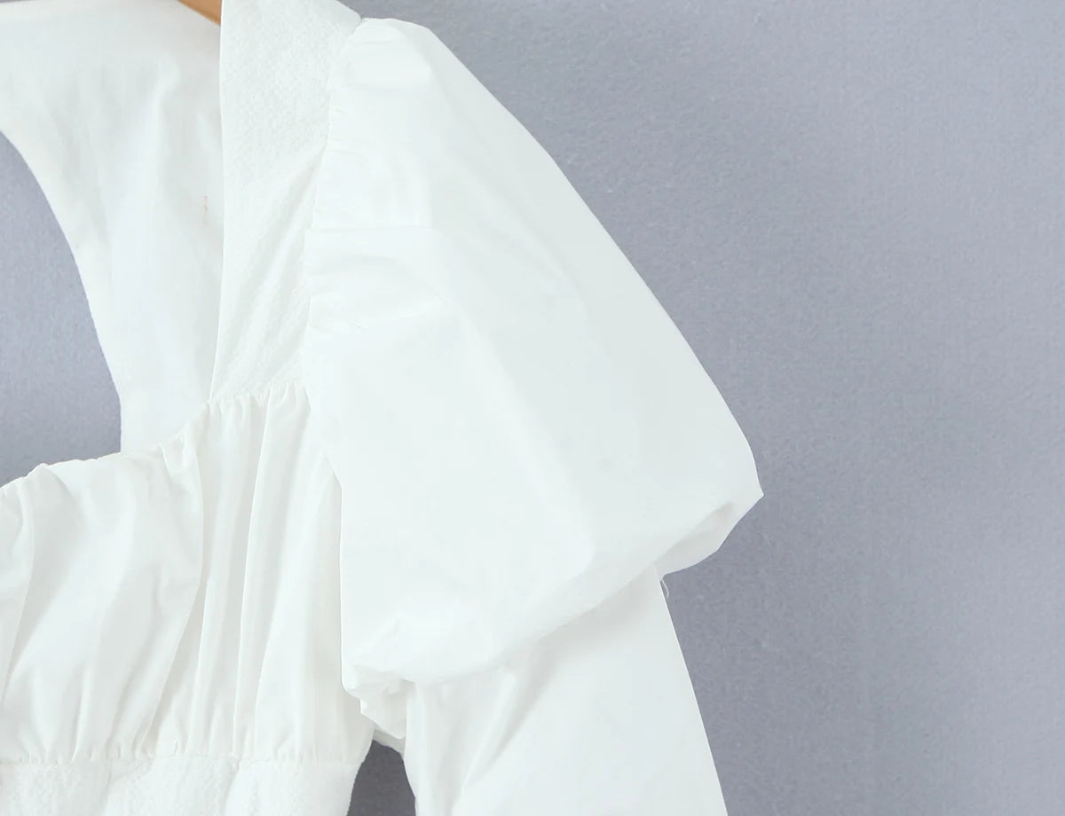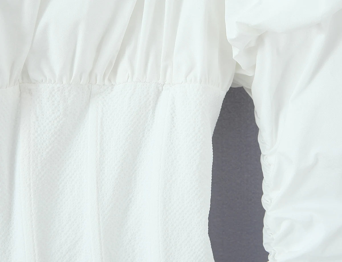 - 🤍 Voluminous Puff Sleeves: Retro-inspired puff sleeves with ruched cuffs add a dramatic, feminine touch.
