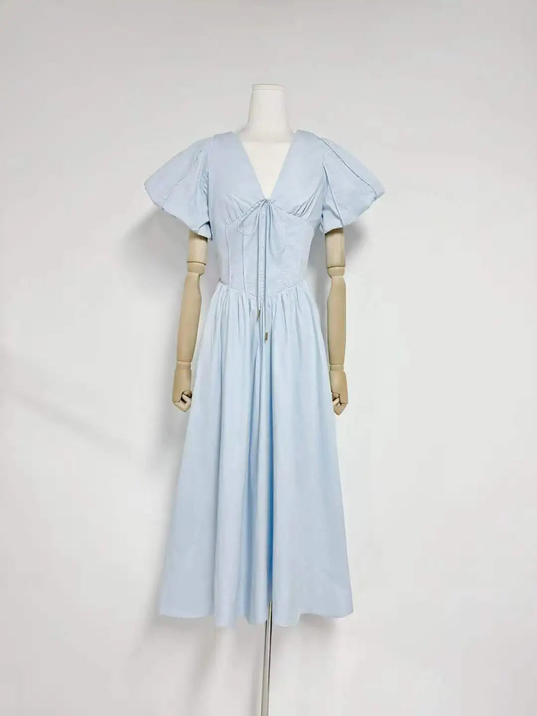 Embrace effortless summer style with our Puff Sleeve Corset Midi Dress. Crafted from lightweight cotton fabric, this romantic dress features a V-neck tie-front, structured corset bodice and voluminous puff sleeves—ideal for sunny days and casual outings.