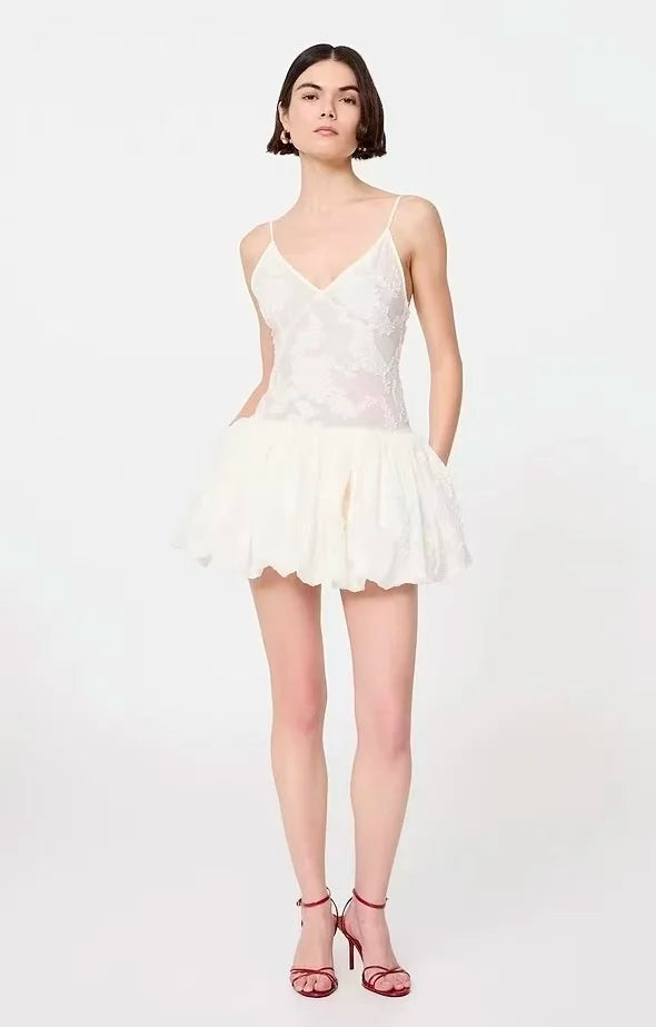 Step into delicate romance with our Textured Floral Mini Dress. Crafted from 70% nylon + 30% polyester stretch fabric, this feminine dress features a V-neckline, thin spaghetti straps and a playful bubble hem—ideal for making a sweet statement at any occasion.