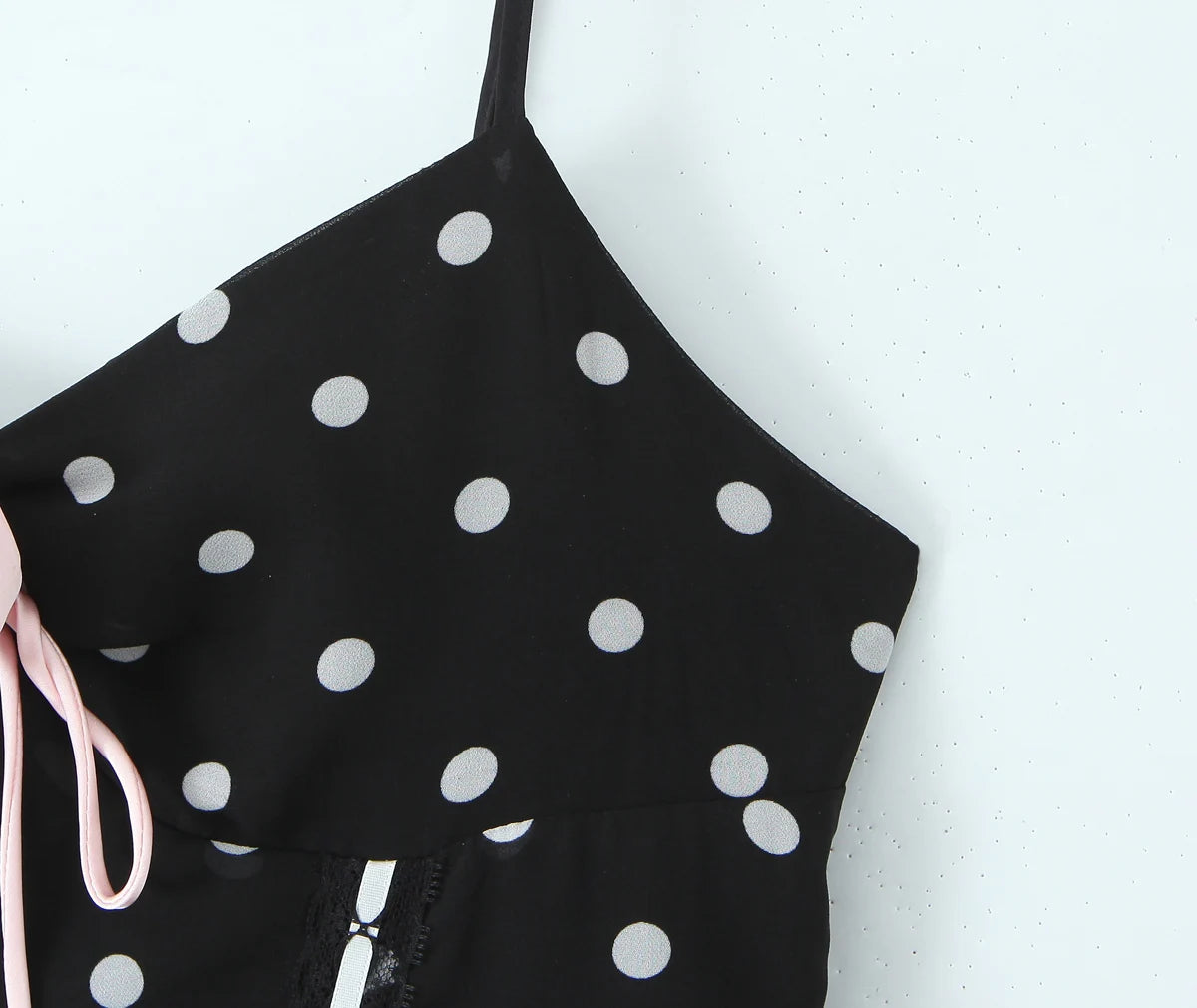 3. Features: Adjustable spaghetti straps, sweetheart neck with 3D pink rose detail, white polka dot print on black base, corset bustier with pink drawstrings, back lace up design, flowy sheer ruffle hem