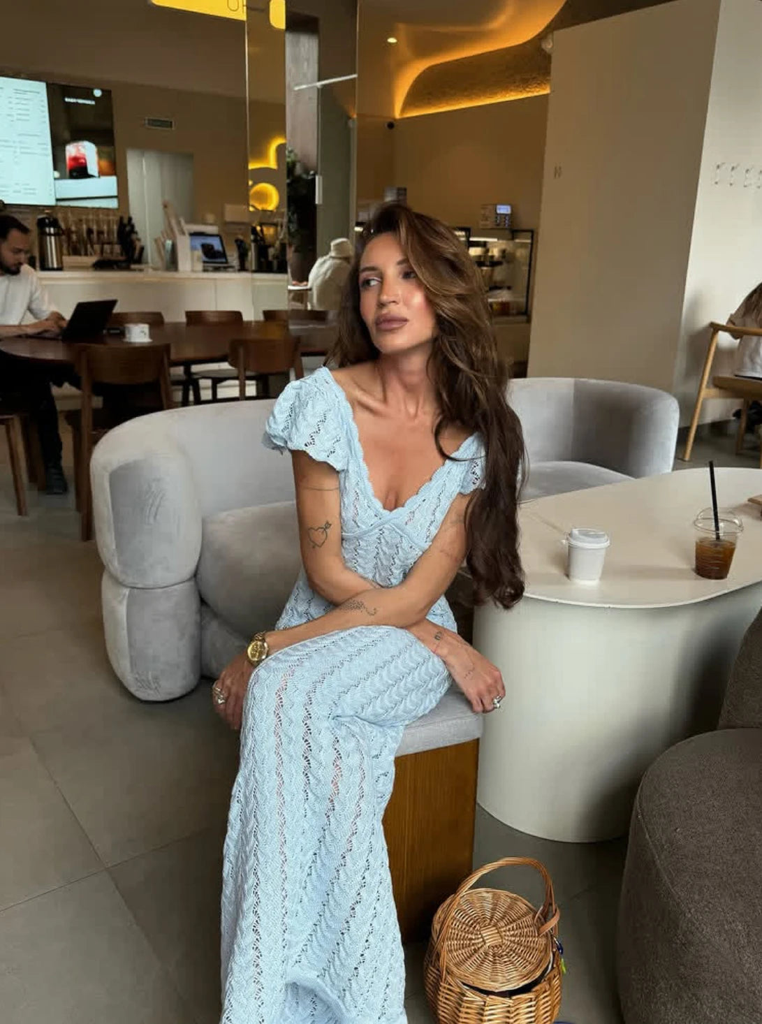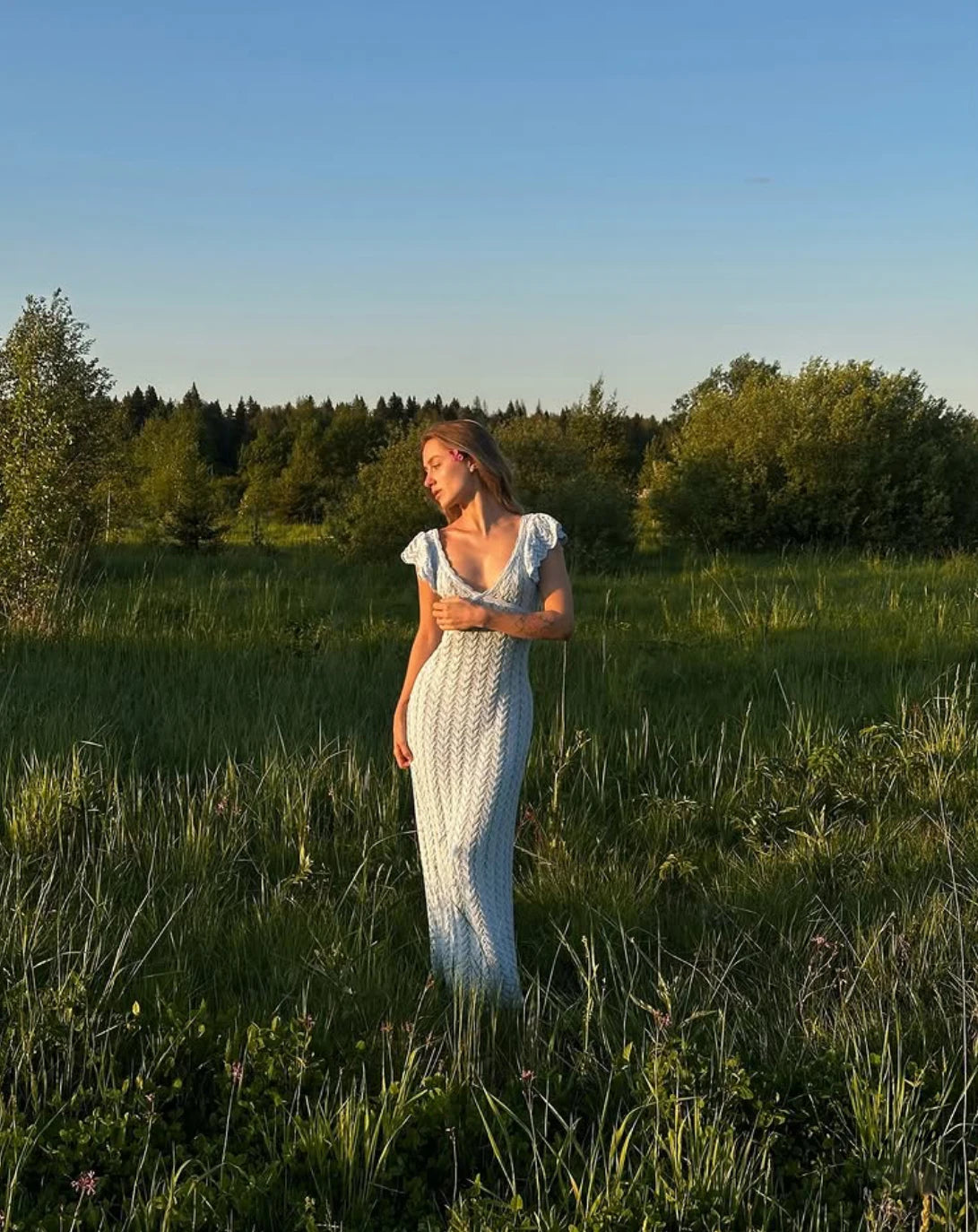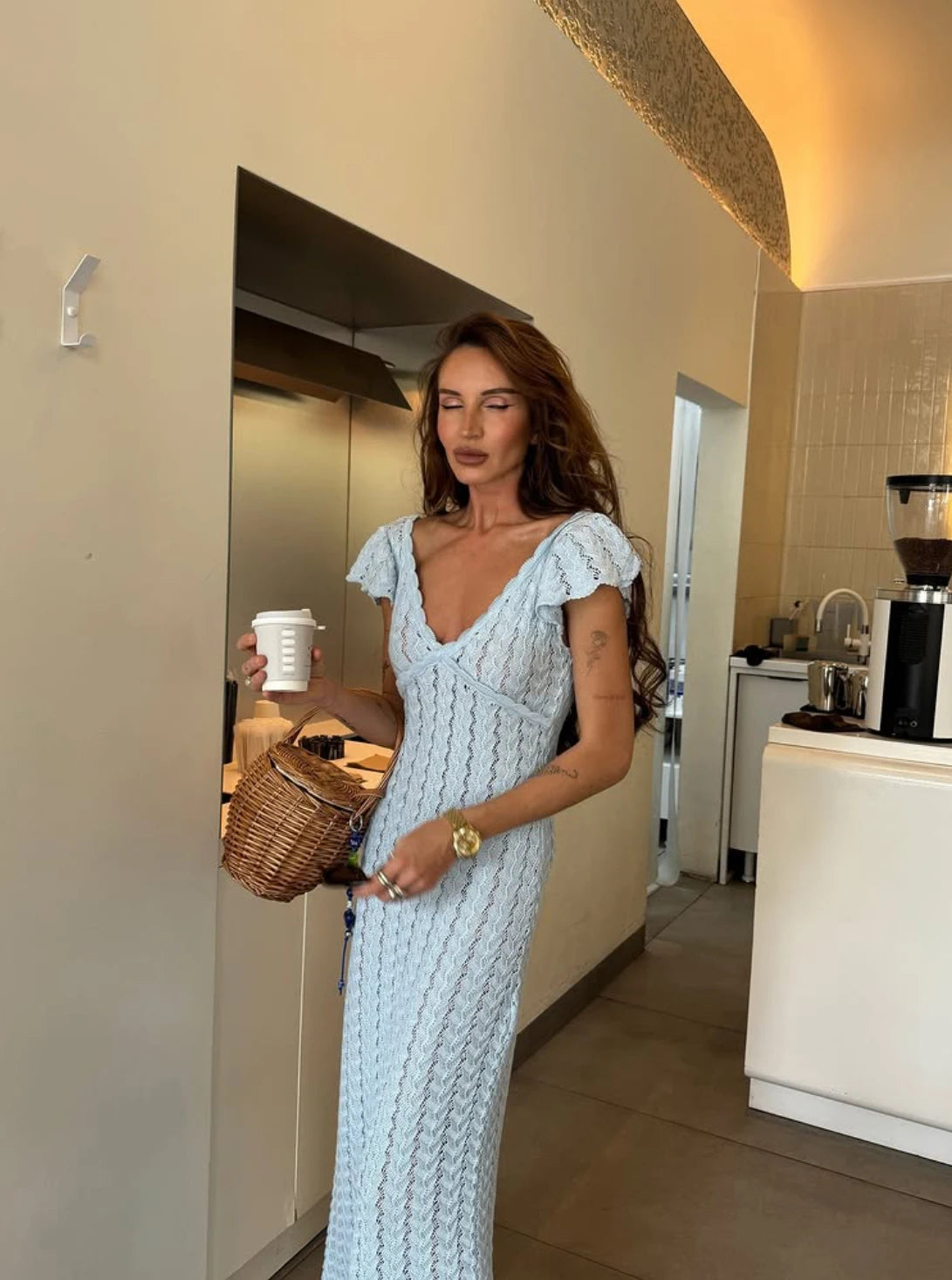 Embrace effortless boho summer style with our Crochet Knit Maxi Dress. Crafted from a soft blend fabric, this feminine dress features a deep V-neck, backless design and ruffle cap sleeves—ideal for sunny days, beach trips and casual outings.