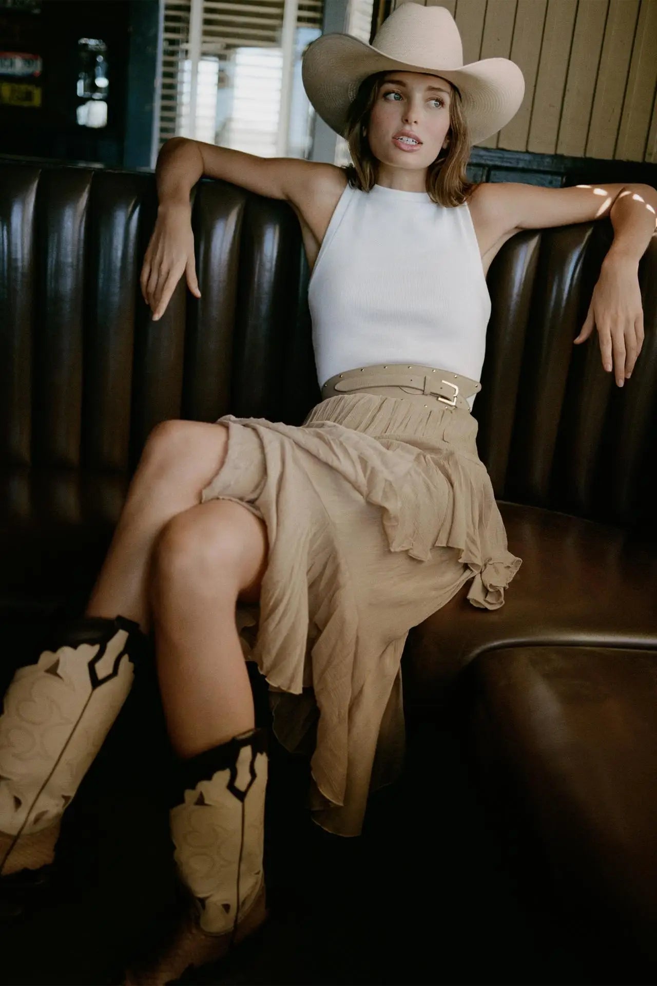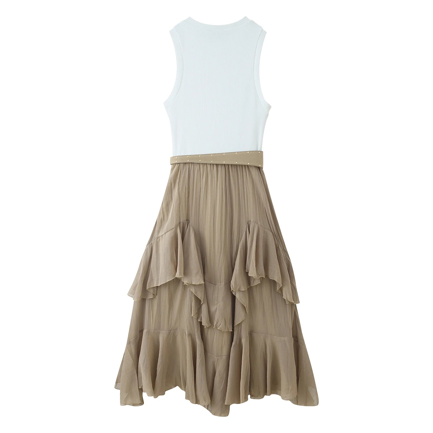 Embrace effortless western chic with our 2-in-1 Ruffle Maxi Dress. This versatile piece features a fitted white ribbed tank top paired with a flowy beige tiered ruffle chiffon skirt, complete with a statement studded suede belt—ideal for cowgirl-inspired looks, summer festivals and casual outings.