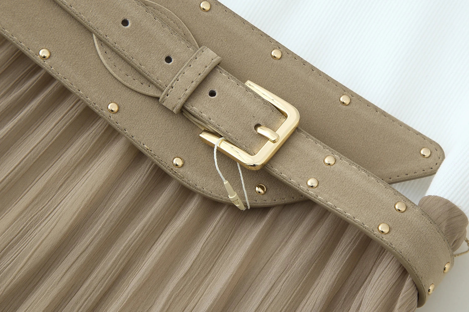 - 🔩 Studded Suede Belt: Wide beige suede belt with gold studs and a large gold buckle, cinches the waist for a flattering shape.